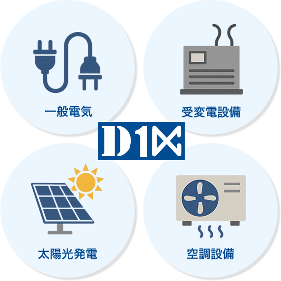 名古屋市・愛知県を中心に、「一般電気工事」「受変電設備工事」「太陽光発電工事」「空調設備工事」を通して、地域の快適な暮らしと産業を支えています。一般住宅やオフィス、商業施設、工場などを対象に、配線工事や空調設備、再生可能エネルギーの導入まで幅広く対応。中部電力からの委託工事も請け負い、信頼と実績を積み重ねています。